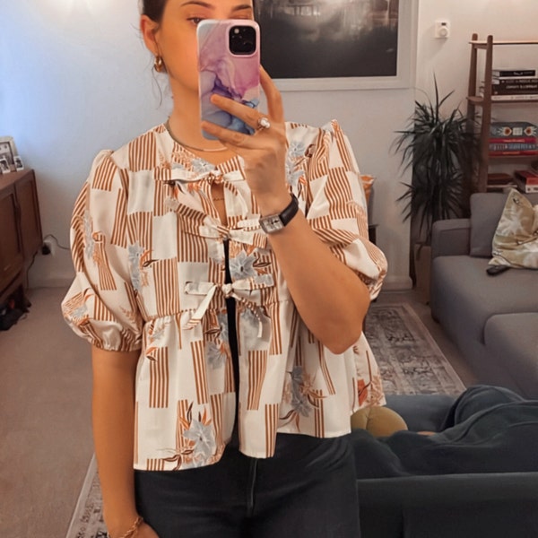 Add a chic, versatile blouse to your wardrobe! This digital sewing pattern creates a loose-fitting top with puffed sleeves and playful front ties that look like bows when tied. Perfect for dressing up or down, this pattern is suitable for beginners and advanced sewists alike.