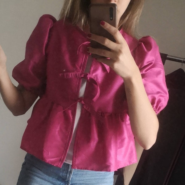 🎀 Style: Loose fit with puffed sleeves and tie-front detail